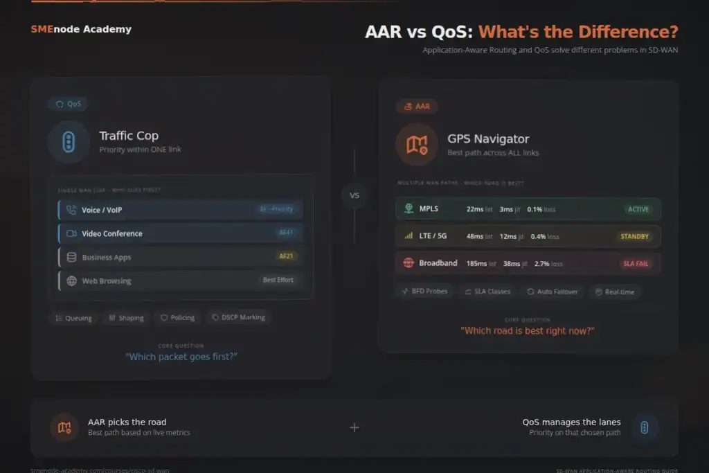 AAR is what makes SD-WAN smart. Without it, you’ve got an overlay with fancy tunnels. With it, you’ve got a WAN that watches performance and picks the best path for every app. Big difference.