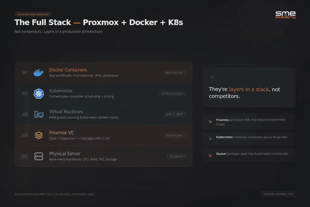 In a typical production setup, Proxmox runs the VMs, those VMs run Kubernetes, and Kubernetes manages your Docker containers. They’re layers in a stack, not competitors.